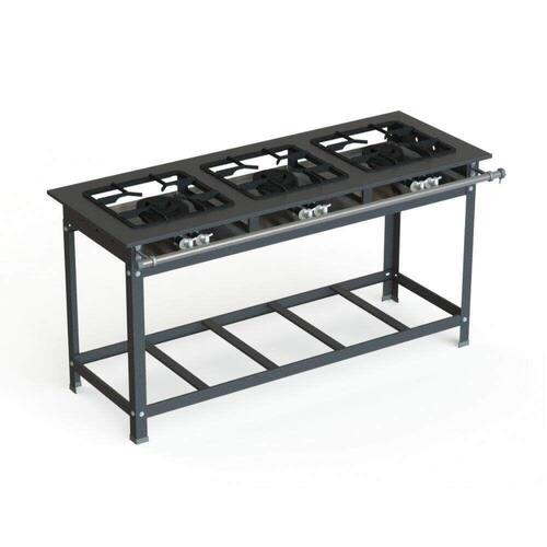 O Fogão Industrial 3 bocas, baixa pressão,possui material em aço carbono com pintura epóxi, grelha 30x30 sendo ela e o queimador em ferro fundido e mesa perfil 7