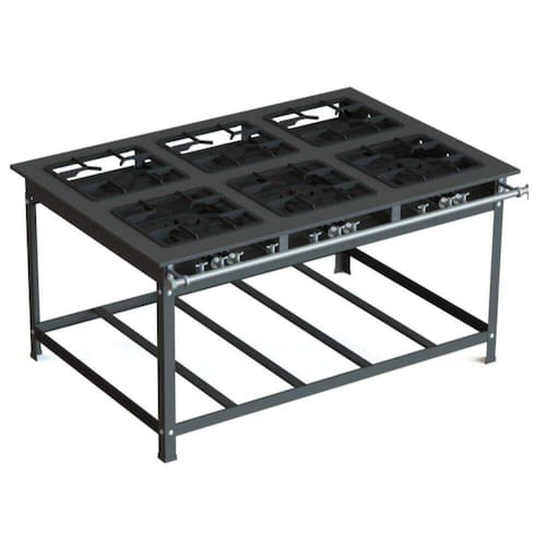 O Fogão Industrial 6 bocas, baixa pressão, Possui material em aço carbono com pintura epóxi, grelha 30x30 sendo ela e o queimador em ferro fundido e mesa perfil 7
