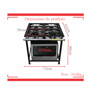 Fogão Industrial de Baixa Pressão À Gás GLP (BOTIJÃO)Linha Tradicional Perfil 7Grelhas em ferro fundido 30cmx30cm2 Queimadores Duplos 170mm 2 Simples 130mmBandeja coletora de resíduoPintura preta texturizada epóxi de alta resistênciaChapa em aço carbonoForno de 92L Tampa de VidroMedidas do Fogão Montado:Altura : 80cmLargura : 73cmProfundidade : 83cm Marca: Não Informado Ean: 7891037016774