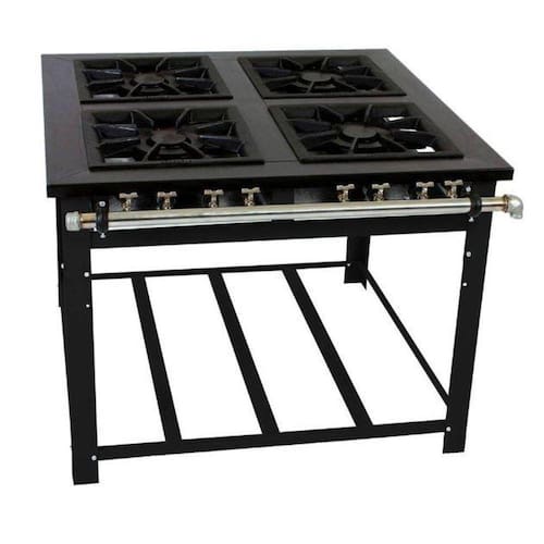 Gás GLP baixa pressão; Tubo distribuidor (varão) de 1 com acabamento cromado, possuindo tampão e entrada de gás reversível; Opção de queimadores simples (120mm de diâmetro) ou duplos (180mm - com controle individual das chamas) em ferro fundido, fixos por encaixe; Queimadores de alto rendimento, possuindo potência de 3.021 kcal/h no modelo simples e 5.586 kcal/h no modelo duplo; Totalmente desmontável, facilitando o transporte e armazenagem; Corpo e mesa de aço carbono super resistente, com acabamento em pintura pó eletrostática, com base fosfatizada, grelha de ferro fundido de 40x40cm e mesa com perfil 10cm; Registro cromado 1/4; Bandeja coletora em aço galvanizado; Limpeza e manutenção facilitadas, pois os queimadores são encaixados, facilitando a remoção; Equipamento para uso industrial e profissional.