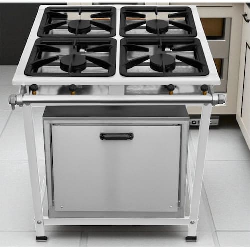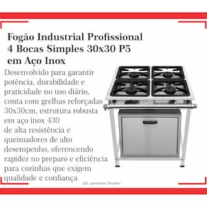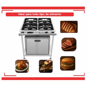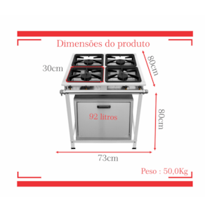 Fogão Industrial de Baixa Pressão À Gás GLP (BOTIJÃO)Linha Standard Perfil 5Grelhas em ferro fundido 30cmx30cm4 Queimadores Simples 100mmBandeja coletora de resíduoChapa em aço Inox 430Forno de 92L Tampa em Aço InoxMedidas do Fogão Montado:Altura : 80cmLargura : 73cmProfundidade : 80cm Marca: Não Informado Ean: 7892410843222