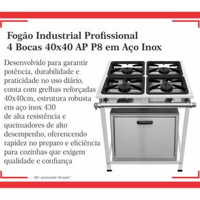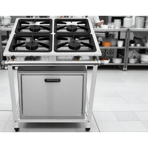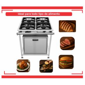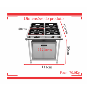 Fogão Industrial de Alta Pressão À Gás GLP (BOTIJÃO)Linha Luxo Inox Perfil 8Grelhas em ferro fundido 40cmx40cm4 Queimadores Simples 130mmBandeja coletora de resíduoChapa em aço Inox 430Forno de 112L Tampa em Aço InoxMedidas do Fogão Montado:Altura : 80cmLargura : 111cmProfundidade : 101cm Marca: Não Informado Ean: 7890164500675