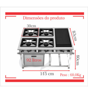 Fogão Industrial de Baixa Pressão À Gás GLP (BOTIJÃO)Linha Tradicional Perfil 7Grelhas em ferro fundido 30cmx30cm2 Queimadores Duplos 170mm 2 Simples 130mmBandeja coletora de resíduoChapa em aço Inox 430Forno de 92L Tampa em Aço InoxMedidas do Fogão Montado:Altura : 80cmLargura : 115cmProfundidade : 83cm