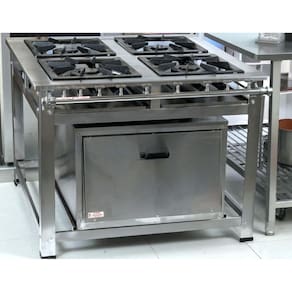 Fogão Industrial de Baixa Pressão À Gás GLP (BOTIJÃO)Linha Luxo Inox Perfil 8Grelhas em ferro fundido 40cmx40cm4 Queimadores Triplos 170mmBandeja coletora de resíduoChapa em aço Inox 430Forno de 92L Tampa em Aço InoxMedidas do Fogão Montado:Altura : 80cmLargura : 111cmProfundidade : 101cm