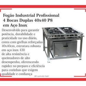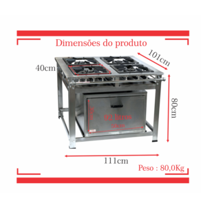 Fogão Industrial de Baixa Pressão À Gás GLP (BOTIJÃO)Linha Luxo Inox Perfil 8Grelhas em ferro fundido 40cmx40cm4 Queimadores Duplos 170mmBandeja coletora de resíduoChapa em aço Inox 430Forno de 92L Tampa em Aço InoxMedidas do Fogão Montado:Altura : 80cmLargura : 111cmProfundidade : 101cm Marca: Não Informado Ean: 7891077836523