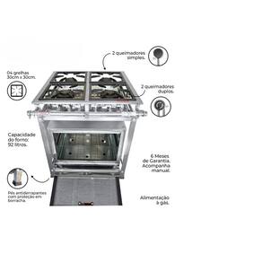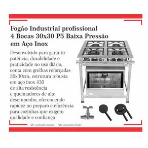 Fogão Industrial 4 Bocas 30x30 P5 em Aço Inox02 Queimadores Simples 100mm02 Queimadores Duplos 140mmEstrutura Confeccionada em Aço Inox 430Grades em Ferro Fundido Queimadores em Ferro FundidoPerfil 5 (5cm Entre os Queimadores) Forno de 92L Tampa de Vidro Garantia : 06 Meses Contra Defeitos de Fabricação.Medidas:Altura : 80cmLargura : 73cm Profundidade : 80cm Marca: Não Informado
