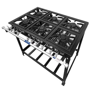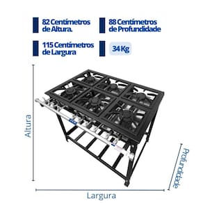 Material da Estrutura: Chapa de Aço Carbono Material do Registro Regulador de Gás: Zincado Material do Queimador: Ferro Fundido à alta temperatura Material dos Pés: Aço Carbono Desmontáveis e Sapatilhas de Borracha Antiderrapante Grelha: 30x30cm contendo 6 dedos em Ferro Fundido Mesa: Perfil 7 Pintura: Preto Texturizado Funcionamento: À Gás Acendimento: Manual Pressão do Gás: Baixa Pressão Queimadores: 3 Queimadores Simples e 3 Queimadores Duplos Consumo: 600gr/hr por queimador queimador duplo e 300gr/hr por queimador simples