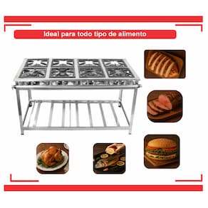Fogão Industrial de Baixa Pressão à Gás GLP (BOTIJÃO) Linha Inox Mesa Perfil 7 Grelhas em ferro fundido 30x30CM (6 dedos) 4 Queimadores Triplos de 170mm e 4 Simples de 130mm em Ferro Fundido Bandeja coletora de resíduo em Aço Galvanizado Estrutura em aço inox 430 (mesa, pés, paneleiro) Dimensões do Fogão Montado: ALTURA: 81 cm LARGURA: 155 cm PROFUNDIDADE: 88 cm