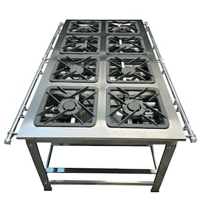 O Fogão Industrial de Centro 8 Bocas 4 Duplas Cefaz Linha Gold Baixa Pressão Inox com Forno 100 Litros Tampa de Vidro C-I430-CFZG-167+I430-FRG-22 é um equipamento completo, ideal para restaurantes, lanchonetes, escolas e diversos tipos de comércio que buscam qualidade e eficiência. O fogão industrial é projetado para agilizar e facilitar o serviço na cozinha, oferecendo um visual elegante e alta performance. Sua mesa estampada evita o acúmulo de resíduos, garantindo máxima higiene. Com um tubo de alimentação de gás de 1 1/4 polegada, proporciona excelente vazão de gás para os queimadores. As grelhas de ferro fundido 40x40 cm suportam panelas e tachos pesados, permitindo um cozimento rápido e eficaz, mesmo em longas horas de funcionamento e altas temperaturas. A estrutura do fogão é feita em aço inox 430, oferecendo durabilidade e resistência.