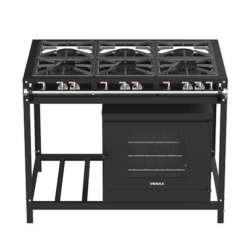Ficha Técnica: Tipo: Fogão Industrial FFI 630-2 Alimentação: Gás GLP Baixa Pressão Registros: Industriais Cromados Número de Queimadores: 3 Queimadores duplos de 150mm e 3 Queimadores de 120mm Acendimento: Manual Entrada de Gás: Dupla (Reversível) Material das Trempes: Ferro Fundido Dimensões das Trempes: 30 x 30 Cm Material dos Queimadores e Espalha Chapa: Ferro Fundido, pintados em preto Estrutura do Fogão: Aço Revestido com Pintura Eletrostática Perfil da Mesa: Em "U" de 60 mm Material da Mesa: Aço Revestido com Pintura Eletrostática na Cor Preta Bandeja Coletora de Resíduos: Sim Material da Corpo: Aço Revestido com Pintura Eletrostática na Cor Preta Forno: Sim Prateleira no Forno: Uma Prateleira Regulável Revestimento Interno do Forno: Easy Clean Isolamento do Forno: Lã de Vidro Termômetro do Forno: Não Porta do Forno: Aço com Visor Puxador da Porta: Aço com sistema de Tranca Dimensões Internas do Forno(LxPxA): 500x468x340(mm)* Volume do Forno: 77L* Potência do Queimador de Mesa:: 3,00kW (queim. 120mm) 5,50kW (queim. 150mm) Potência do Queimador do Forno: 4,50 kW Garantia: 1 Ano Contra Defeito de Fabricação Marca: Venax