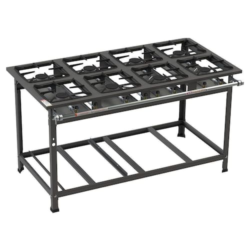 As grelhas são confeccionadas em ferro fundido no tamanho 30x30. O produto apresenta tubo coletor de gás pintado e bandeja coletora de resíduos.