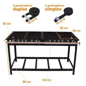 A potência pode variar, mas geralmente um fogão de 8 bocas oferece uma potência considerável para atender às demandas de uma cozinha comercial, proporcionando eficiência no preparo dos alimentos.