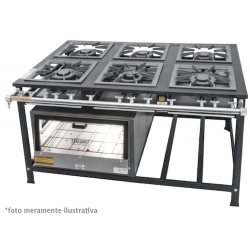 Fogão Industrial Tradicional 40x40 Baixa Pressão 6 Bocas Com Forno Itajobi Fogão Industrial Tradicional 40x40 Baixa Pressão 6 Bocas com Forno Itajobi. Ideal para cozinhas, restaurantes, bares e similares. Possui 6 bocas de baixa pressão, sendo: 3 queimadores simples e 3 queimadores duplos, fabricados em ferro fundido. Tubo coletor de gás zincado e bandeja coletora de resíduos. CONSUMO DE GÁS QUEIMADOR SIMPLES: 0,200kg/hr. CONSUMO DE GÁS QUEIMADOR DUPLO: 0,360kg/hr. DIMENSÕES(CxAxL): 152x80x111cm. CAPACIDADE DO FORNO: 87 Litros. Fogão Industrial Tradicional 40x40 Baixa Pressão 6 Bocas com Forno Itajobi é na OverFrio.