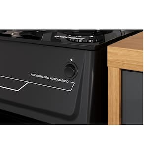 O modelo traz trempes com 6 apoios e acabamento fosco, garantindo mais estabilidade para as panelas durante o uso. Já o puxador em aço com design moderno oferece conforto e segurança ao manusear a porta do forno.