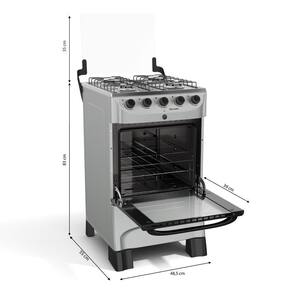 Voltagem: Bivolt | Mesa: em inox | Tipo de acendimento: Acendimento automático total, na mesa e no forno | Largura (cm): 48,5cm | modelo: Fogão 4B Titanio MFI4BB | Porta do forno: De vidro | Altura (cm): 87cm | Peso (Kg): 16,4Kg | Cor: Titânio | Queimadores: de Aço Esmaltado em Easy clean | Tipo de Fogão: A Gás, de Piso | Prateleiras do forno: Uma grade ajustável em dois níveis de altura | Quantidade de bocas: 4 Bocas