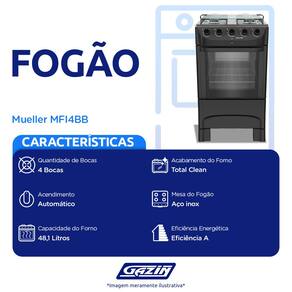 Características: Fogão Marca: Mueller Modelo: MFI4BB Origem: Nacional Quantidade de bocas: 4 Bocas Acendimento: Automático Material da mesa: Aço inox Funcionamento: GLP - A conversão para GN precisa ser adaptada, conforme consta no manual do produto -verificar se realmente tem GN- Potência dos queimadores: Família: 2000W - Médio: 1700W - Forno: 1900W Manípulos removíveis: Sim Tampa de vidro: Sim Capacidade do forno: 48,1 Litros Prateleiras do forno: 1 Prateleira ajustável Forno Autolimpante: Não Acabamento do forno: Total Clean Eficiência energética: A Grill: Não Relógio: Não Termostato: Não Bandeja coletora de resíduos: Não Forno duplo: Não Válvula de segurança no forno: Sim Sistema corta gás: Sim Possui Pés: Sim