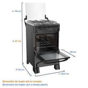 Forno Com uma capacidade de 48,1 litros o forno possui acendimento automático e tecnologia Total Clean para facilitar a limpeza e um visor amplo para melhor acompanhar o preparo do prato. as grades são ajustáveis com dois níveis de altura. O forno possui ainda um sistema com válvula de segurança que corta a saída de gás caso as chamas se apaguem acidentalmente, evitando acidentes e garantindo mais segurança em sua casa.