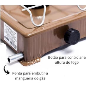 Fogão a Gás Fogareiro 2 bocas para Camping Portátil branco - Para uso com botijão de gás com regulador de baixa pressão. Fácil de usar, limpar e transportar.Medidas aproximadas: comprimento 46 x profundidade 23 x altura 5cmItens Inclusos: 1 Fogão a gás 2 bocas branco;Os fogões baixa pressão camping utilizam regulador de gás comum verifique a validade de seu regulador antes da utilização , e por este motivo funcionam somente com gás GLP botijões de gás comuns , eles não irão funcionar em gás encanado pois a pressão de fornecimento é diferente, e pode ocasionar problemas e acidentes. Para a instalação é necessário possuir um regulador de gás, uma mangueira normatizada e abraçadeiras para fixação da mangueira no fogão. Acople a mangueira no tubo do fogão esta parte é um tanto quanto difícil, pois a mangueira é muito justa para evitar ao máximo vazamentos . Caso tenha dificuldades para colocar a mangueira no fogão, tente amolecer com agua quente para facilitar. Após apertar a abraçadeira firmemente entre o tubo e a mangueira, teste com espuma de sabão para verificar a estanqueidade. Antes de ascender o fogão localize todas as conexões existentes, e verifique o aperto das abraçadeiras, e se não possui nenhum vazamento, testando com espuma de sabão. Para um bom funcionamento, o fogão deve apresentar uma chama azulada, caso esteja com cor diferente tente acessar dentro da tubulação a ponta do registro e ver se o pequeno orifício que aparece esta completamente desobstruído. Para ascender o fogão abra o regulador que se encontra próximo ao botijão e depois o registro referente a boca a ser utilizada. O tamanho da chama é regulado pelo registro localizado no painel do fogão. O fogão deve estar localizado em um local arejado, mas não em correntes de vento, pois a mesma pode apagar a chama. Nunca utilize panelas, ou chapas que sejam maiores que as dimensões do fogão. Por ser um produto de pequeno porte e estrutura reduzida não exija a funcionalidade comparada a fogões convencionais ou de maior porte. Para desligar o fogão, deve-se fechar em primeiro lugar o registro próximo ao botijão regulador , após todo o gás localizado na mangueira queimar, sendo assim permitido fechar o registro localizado no painel. Nunca deixe a mangueira passando perto de partes quentes do fogão, e da chama. Nunca instale ou retire o botijão com a chama do queimador acesa ou perto de chamas. Nunca aproxime o fogão de produtos inflamáveis. Mantenha fora do alcance de crianças. Ao sentir o cheiro de gás, não utilize isqueiros ou fósforos, não fume, não acione o interruptor de luz. Se estiver em local fechado abra portas e janelas, e leve para um local arejado. Verifique as conexões da mangueira com o tubo.