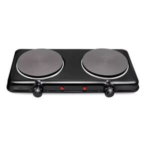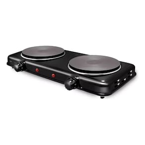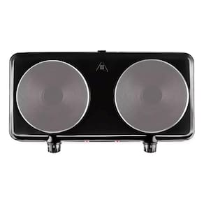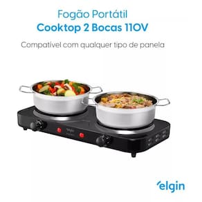Fogão de mesa elétrico portátil com duas placas de aquecimento independentes, cada uma com 1000W de potência. Compatível com qualquer tipo de panela. Possui 5 níveis de controle de temperatura independentes por placa, indicação luminosa de aquecimento e termostato para evitar superaquecimento. Fácil de limpar e com base estável para segurança.Lâmpada piloto