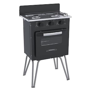 Fogão portátil com 2 bocas a gás GLP, forno com capacidade de 22 litros, acabamento em preto fosco, mesa em inox e trempes esmaltadas. Revestimento interno do forno Easy Clean.Tipo