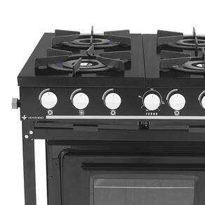O Fogão Industrial Bravo Preto conta com forno, 4 bocas e mesa esmaltada a fogo com sistema Easy Clean, facilitando a limpeza. Conta com sistema de gás GLP de baixa pressão e queimadores de alto rendimento fabricados em ferro fundido, possuindo potência de 3.636 kcal/h nas chamas triplas frontais, 3.021kcal/h nas chamas duplas traseiras e consumo de gás de 1,572kg/h.