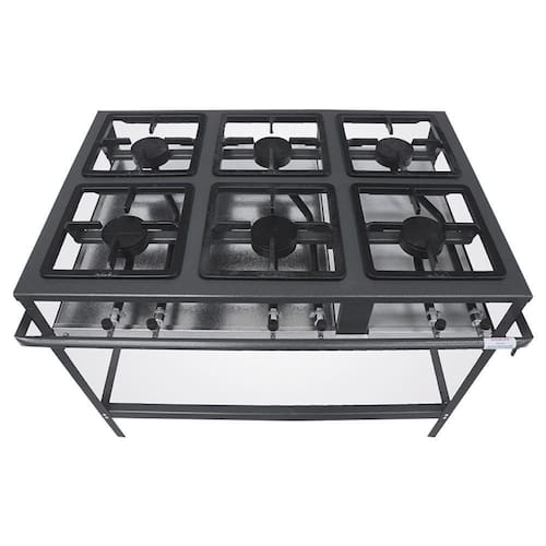 Indicado para restaurantes e cozinhas industriais de médio porte, o Fogão 6 Bocas Stand Baixa Pressão conta com quadro superior estampado com perfil 5, registros em latão forjado e tubo de distribuição de gás com entrada reversível.