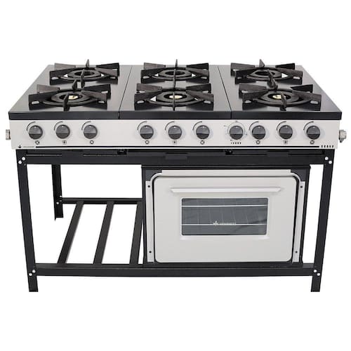 O Fogão Industrial Bravo conta com forno, 6 bocas e mesa esmaltada a fogo com sistema Easy Clean, facilitando a limpeza. Conta com sistema de gás GLP de baixa pressão e queimadores de alto rendimento fabricados em ferro fundido, possuindo potência de 3.636 kcal/h nas chamas triplas frontais, 3.021kcal/h nas chamas duplas traseiras e consumo de gás de 2,168kg/h.