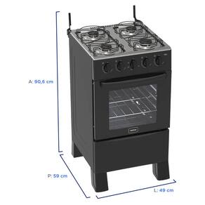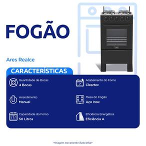 Características: Mesa: Aço inox selada; Queimadores: Esmaltados; Modelo: Ares; Queimador rápido: 1; Queimadores semi rápidos: 3; Capacidade do Forno: 50 Litros; Forno: Easy clean; Puxador da porta do forno: Tubo metálico;
