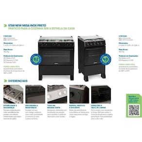 Puxador em aço com design moderno para praticidade e conforto ao abrir a porta do forno.Trempes resistentes que garantem estabilidade das panelas, com laterais arredondadas para evitar acúmulo de sujeira.Acendimento automático para maior comodidade no uso diá amplo com revestimento limpa-fácil, evitando acúmulo de gordura e ípulos removíveis para facilitar a limpeza e manutenção do fogão.Adquira já o seu Fogão Star New 5 Bocas - Preto!