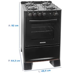 Ficha técnica Marca Suggar Modelo Cook Glass Tipo Fogão de piso Acendimento Automático Material da mesa Vidro Temperado Funcionamento GLP Material das trempes Aço esmaltado Capacidade do forno 56 litros Acabamento do forno Easy clean Altura 92 cm Largura 49,4 cm Profundidade 64,3 cm Peso 21,5 kg Frequência 50/60 Hz