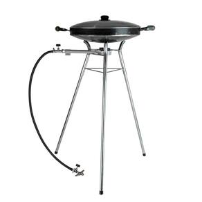 Kit tacho de disco de arado 45cm sem borda + fogareiro flex gás/álcool + tripé de 65cm. Você poderá tanto usar o fogareiro sobre a mesa ou com o tripé. Chapa campeira. Esse produto não é um reaproveitamento de disco de arado, ele é produzido industrialmente em chapa de aço carbono de 3mm, dando mais durabilidade ao tacho, o suporte do cabo é cortado na mesma peça do tacho e o cabo é de madeira torneada de ótima qualidade tornando muito mais resistente. Usamos apenas o nome disco de arado como referência para o produto.