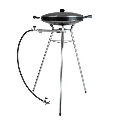 contém: 1 tacho diâmetro de 45cm sem borda em aço carbono 3mm. 1 fogareiro flex gás/ alcool 3 pés alongadores com 70cm 1 abafador para chama do fogareiro.