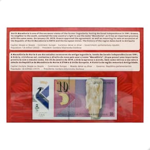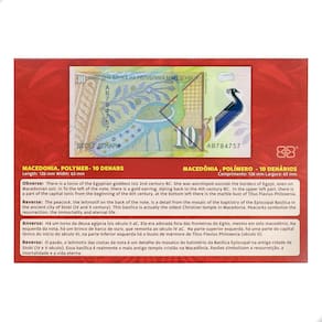 Folder Encarte para Cédula de 10 Denários Banco Nacional da Rep. da MacedôniaO Folder Encarte para Cédula de 10 Denários Banco Nacional da Rep. da Macedônia descreve com detalhes os vários elementos que compõem a cédula de 10 Denários Banco Nacional da Rep. da Macedônia, além de apresentar as cores reais dessa cédula.Para armazenar a cédula, você deve abrir o plástico pela lateral esquerda e então ajustar a cédula. Este anúncio NÃO inclui a cédula.Informações Técnicas:Dimensão Fechada: L: 20cm x A: 14,3cmDimensão Aberta: L: 20cm x A: 28,6cm Marca: Banco Colecionável do Brasil