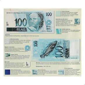 Folder Encarte para Cédula de 100 Reais DescritivoO Folder Encarte para Cédula de 100 Reais Descritivo descreve com detalhes os vários elementos que compõem a cédula de 100 reais da primeira família, além de apresentar as cores reais dessa cédula.No folder são apontados os elementos de impressão em alto-relevo, fibras coloridas, fundos especiais, microimpressões, microchancelas, imagem latente, marca tátil, registro coincidente, fibras luminescentes, fio de segurança, numeração, dimensões, listagem com informações de chancelas entre 1994 a 2007 e descrição do anverso e reverso.O folder tem espaço reservado para colocar 1 (um) cédula de 100 reais da 1ª Família em 1 (um) espaço plástico que é localizada na parte interna do material; a abertura do plástico é feita pela lateral esquerda dele. Para colocar sua cédula você deve abrir o plástico pelo lado citado e inserir a cédula com cuidado.CARACTERÍSTICAS DO FOLDERComprimento: 19,7cmLargura folder fechado: 22,5cmEspaço para 1 cédula de 100 reais da 1ª FamíliaNÃO ACOMPANHA CÉDULA Marca: Numismática Completei