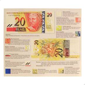 Folder Encarte para Cédula de 20 Reais DescritivoO Folder Encarte para Cédula de 20 Reais Descritivo descreve com detalhes os vários elementos que compõem a cédula de 20 reais da primeira família, além de apresentar as cores reais dessa cédula.No folder são apontados os elementos de impressão em alto-relevo, fibras coloridas, fundos especiais, microimpressões, microchancelas, imagem latente, marca tátil, registro coincidente, fibras luminescentes, fio de segurança, faixa holográfica, numeração, dimensões, listagem com informações de chancelas entre 2002 a 2010 e descrição do anverso e reverso.O folder tem espaço reservado para colocar 1 (um) cédula de 20 reais da 1ª Família em 1 (um) espaço plástico que é localizada na parte interna do material; a abertura do plástico é feita pela lateral esquerda dele. Para colocar sua cédula você deve abrir o plástico pelo lado citado e inserir a cédula com cuidado.CARACTERÍSTICAS DO FOLDERComprimento: 19,7cmLargura folder fechado: 22,5cmEspaço para 1 cédula de 20 reais da 1ª FamíliaNÃO ACOMPANHA CÉDULA Marca: Numismática Completei