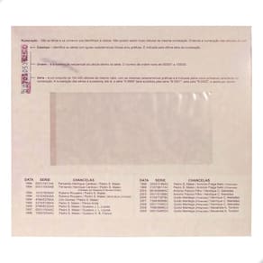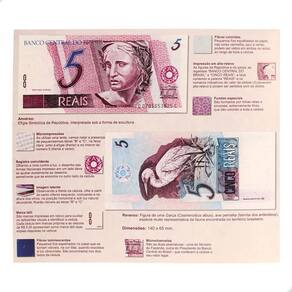 Folder Encarte para Cédula de 5 Reais DescritivoO Folder Encarte para Cédula de 5 Reais Descritivo descreve com detalhes os vários elementos que compõem a cédula de 5 reais da primeira família, além de apresentar as cores reais dessa cédula.No folder são apontados os elementos de impressão em alto-relevo, fibras coloridas, fundos especiais, microimpressões, microchancelas, imagem latente, marca tátil, registro coincidente, fibras luminescentes, numeração, dimensões, listagem com informações de chancelas entre 1994 a 2009 e descrição do anverso e reverso.O folder tem espaço reservado para colocar 1 (um) cédula de 5 reais da 1ª Família em 1 (um) espaço plástico que é localizada na parte interna do material; a abertura do plástico é feita pela lateral esquerda dele. Para colocar sua cédula você deve abrir o plástico pelo lado citado e inserir a cédula com cuidado.CARACTERÍSTICAS DO FOLDERComprimento: 19,7cmLargura folder fechado: 22,5cmEspaço para 1 cédula de 5 reais da 1ª FamíliaNÃO ACOMPANHA CÉDULA Marca: Numismática Completei