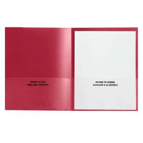 As pastas vermelhas para levar para casa School Smart oferecem proteção máxima e uma aparência divertida e elegante. A construção é feita de polipropileno granulado durável com uma borda clara em relevo para visualizar e colocar seus documentos ou cartões de notas mais importantes. Nossas pastas de 2 bolsos com bordas transparentes incluem um bolso esquerdo com compartimento para cartão de visita e indicações em texto bilíngue “Retorno às aulas”. Cada pasta de plástico para levar para casa para estudantes comporta até 100 folhas de papel.
