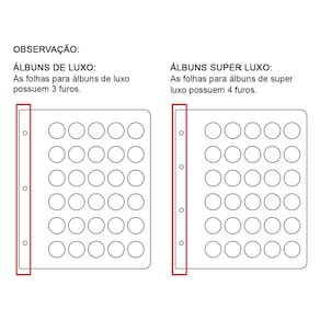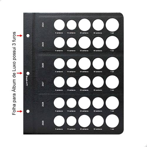 Folha Complementar de Moedas do Plano Real de 2024 a 2029 para Álbum de Luxo nº 4.A folha Complementar é para atualizar sua coleção de moedas do Plano Real no Álbum Super Luxo caso sua versão do álbum for a antiga, sem espaço para a moeda do Plano Real:- 2024 (5 centavos, 10 centavos, 25 centavos, 50 centavos e 1 real)- 2025 (5 centavos, 10 centavos, 25 centavos, 50 centavos e 1 real)- 2026 (5 centavos, 10 centavos, 25 centavos, 50 centavos e 1 real)- 2027 (5 centavos, 10 centavos, 25 centavos, 50 centavos e 1 real)- 2028 (5 centavos, 10 centavos, 25 centavos, 50 centavos e 1 real)- 2029 (5 centavos, 10 centavos, 25 centavos, 50 centavos e 1 real)Os álbuns adquiridos antes da emissão dessas moedas, não possuem espaço para a mesma. Sendo necessário atualizar seu álbum adquirindo a folha complementar deste anúncio.Basta tirar os grampos de proteção que prendem as folhas, trocar sua página de moedas comemorativas pela nova página adquirida, e colocar os grampos de proteção novamente.O material da Folha Complementar é do mesmo material e cor do Álbum de Luxo Preto.OBSERVAÇÃO: As folhas para Álbuns de Luxo e Super Luxo possuem as furações diferentes. As folhas para o Álbum de Luxo possuem 3 furos e as Folhas para o Álbum Super Luxo possuem 4 furos. Marca: Não Informado