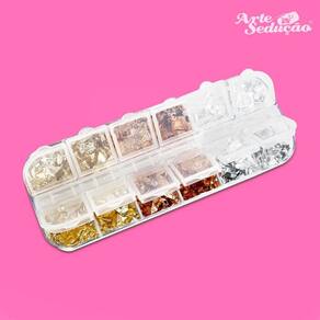 O kit inclui cores vibrantes que trazem uma aparência moderna, criativa e ousada às unhas, incluindo o bronze que está muito em alta nas decorações a combinação dessas três cores resultará em uma arte linda. Acompanha caixa de plástico com divisórias e tampas para melhor conservação e organização evitando desperdícios e sujeira em seu uso e aplicação. Folhas cortadas em diversos tamanhos.