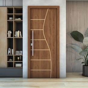 Imagine uma porta que une a beleza clássica da madeira com a praticidade e a uniformidade do MDF, finalizada com um verniz elegante que realça seus detalhes e oferece proteção duradoura, e com um enchimento inteligente que a torna mais leve sem comprometer a sua estrutura.