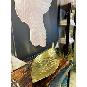 FOLHA DECORATIVA ALUMINIO GRANDE DOURADO 75X28CM Travessa folha decorativa em aluminio fundido dourado, com formato de folha e acabamento texturizado que reflete a luz de maneira elegante. O design alongado, com nervuras marcadas e um leve brilho metálico, transmite sofisticação e um toque contemporâneo.