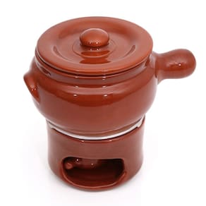 Conjunto Para Fondue Cerâmica Motta Com Placa Difusora de ferro usada em mesas de profissional e doméstico. Charmosas cheias de estilo, com características rústicas, que enfeitam e deixam mais bonitos os ambientes. Produto contém 5 peças:caçarola com tampa nº1chapa de ferro nº 1rechaud nº 1espiriteiraMaterial: Cerâmica de Barro VidradaCapacidade da caçarola: 1200 ml