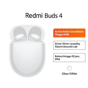 1x Par de Fone Bluetooth Buds 4, 1x Estojo de Carregamento, 1x Cabo USB-C, 1x Manual e Termo de Garantia, 3x pares de ponteiras de silicone P, M e G Ponteira de silicone M instalada nos fones