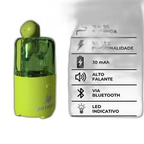 Especificações: - Conexão Bluetooth - Som de Alta Qualidade - Indicador de Bateria - Placa de Armazém de Áudio: A13 AC6965E - Fones de Ouvido: Alto falante com fio de cobre F13 - Caixa de Som: Auto Falante Magnético interno de 36-31 - Distância de Transmissão Bluetooth: Até 15 metros - Bateria do Fone de Ouvido: 30mAh - Bateria da Caixa de Som: 450mAh com placa protetora - Tempo de Reprodução do Fone de Ouvido: 3-4 horas - Tempo de Uso Contínuo: Até 2,5 horas - Cor: Verde ===================================== Devido à diferença entre monitores e iluminação diferentes, pode haver variação na tonalidade apresentada no anúncio. Medidas muito aproximadas. Homologação Anatel: 106282313927 Marca: Não Informado Ean: 6013400036399