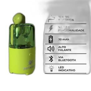 Especificações: - Conexão Bluetooth - Som de Alta Qualidade - Indicador de Bateria - Placa de Armazém de Áudio: A13 AC6965E - Fones de Ouvido: Alto falante com fio de cobre F13 - Caixa de Som: Auto Falante Magnético interno de 36-31 - Distância de Transmissão Bluetooth: Até 15 metros - Bateria do Fone de Ouvido: 30mAh - Bateria da Caixa de Som: 450mAh com placa protetora - Tempo de Reprodução do Fone de Ouvido: 3-4 horas - Tempo de Uso Contínuo: Até 2,5 horas - Cor: Verde ===================================== Devido à diferença entre monitores e iluminação diferentes, pode haver variação na tonalidade apresentada no anúncio. Medidas muito aproximadas. Homologação Anatel: 106282313927 Marca: Não Informado
