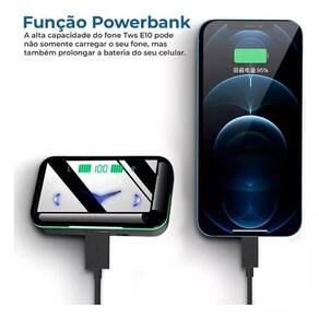 Este carregador também é um power bank, Carrega a bateria do seu celular através da entrada frontal de usb, de forma emergencial, não carrega totalmente a bateria do celular, com o carregador com carga completa, irá carregar cerca de 15% da capacidade total da bateria do celular. Possui microfone para atender chamadas telefônicas com apenas um toque. Som surround premium. Sensibilidade: 95+3db Conectividade: sem fio Versão de bluetooth: v5.0 + edr Tempo de espera: 8 a 10h Tempo para música: 4 a 5 aproximadamente Tempo de conversação: 4 a 5aproximadamente Tempo de carregamento: 1 a 2h Distância de transmissão: 10 m Bateria do case de carregamento: 2200 mah Bateria do fone: 50 mah Resposta de frequência: 50-8khz Compatível com: todos os aparelhos com bluetooth