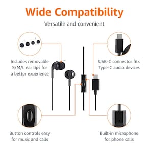 Amazon Basics Fones de ouvido USB-C com fio com microfone, fones de ouvido intra-auriculares, cabo de 1,3 m de comprimento, pontas auriculares P/M/G, preto - Design de fones de ouvido com fio e intra-auricular: fones de ouvido com fio confortáveis com fones de ouvido de silicone e pontas auriculares removíveis P/M/G para uma melhor experiência. - Fone de ouvido USB-C com ampla compatibilidade: fones de ouvido com fio amplamente compatíveis para telefones, laptops, tablets PCs e dispositivos com portas de áudio tipo C. - Experiência de audição aprimorada: os fones de ouvido com fio USB-C Amazon Basics oferecem frequências altas, médias e baixas equilibradas para voz e som realistas. - Função útil: microfone integrado e controles de botão para chamadas telefônicas convenientes e controle de reprodução de áudio. Observação: o botão de controle suporta atender, encerrar e recusar chamadas. Ele também controla a reprodução, pausa, próxima e faixa anterior ao reproduzir música. O ajuste de volume e o controle do microfone não são suportados; use seu dispositivo conectado para essas funções. - Fácil de transportar, fácil de armazenar: fones de ouvido com fio compactos plug-and-play que são portáteis e fáceis de armazenar. - Dimensões do produto: 133 x 2 x 1,3 cm (CxLxA) com um cabo de 1,3 m.