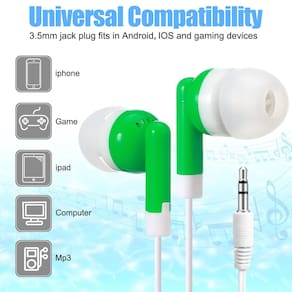 Características: Cada fone de ouvido é embalado individualmente, conveniente para seu uso, fones de ouvido multicoloridos para estudantes de bibliotecas de salas de aula escolares. Esses fones de ouvido não são apenas leves, mas também o cabo dos fones de ouvido não se enrosca facilmente, proporcionando uma boa experiência sonora. Especificações: Cor: branco, rosa, preto, verde, azul Comprimento: aproximadamente 3,3 pés/1 metro Conector de áudio: 3,5 mm O pacote inclui: 100 x fones de ouvido Notas: Pode haver pequenas diferenças de cor devido ao monitor, câmera ou outros fatores. Consulte os itens físicos. Medição manual, permita pequenos erros de tamanho. A menção de nomes de marcas e quaisquer modelos relacionados acima é apenas para fins de demonstração de compatibilidade.