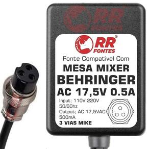 Fonte compativel com mixer mesa de som behringer eurorack Ac 17,5v 500ma bivolt com chave de seleção de voltagem 110v/220v Para os modelos; Eurorack mx1602 Eurorack mx1604a Eurorack mx802a Pro mixer dx100 Pro mixer dx500 Foto meramente ilustrativa Rrfontes