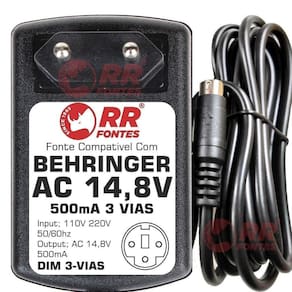 Fonte compatível com mixer mesa de som behringer xenyx eurorack. Ac 14,8vac 500ma x2, plug dim 3 vias, com chave de seleção de voltagem 110v/220v. Atende os seguintes modelos: Mx-6, Ub1002fx, Ub1202fx, Xenyx 1002fx, Xenyx 1202fx, Qx1002usb, Qx1202usb.Demonstração 360º